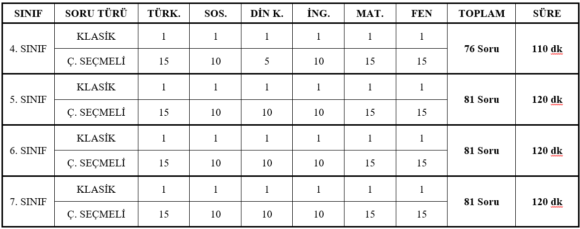 KATILACAK SINIFLAR: 4, 5, 6 ve 7. Sınıflar SINAV TAKVİMİ: Sınav 11 Ocak 2026 Pazar günü, 4. Sınıflar saat 14.00’de 5, 6 ve 7. Sınıflar saat 10.00’da yapılacaktır. Sınav Başvuruları 1 Aralık 2025 Pazartesi günü başlayıp 8 Ocak 2026 Perşembe günü sona erecektir. Bu tarihten sonra başvuru kabul edilmeyecektir. Sınava katılım kontenjanlarla sınırlıdır. Sınav sonuçları değerlendirme süreci sona erdiğinde okulumuzun internet sitesinden açıklanacaktır. KATILIM ŞARTLARI: - Sınava 2025-2026 öğretim yılında ilimiz genelinde bulunan resmi/özel İlkokul 4.sınıf ve Ortaokul 5, 6 ve 7. sınıflarına devam eden öğrenciler katılabilirler. - Sınava başvurular okulumuzun web sitesinden yapılacaktır. - Başvuru sahibinin sınava katılmaması durumunda yerine başka öğrenci sınava giremeyecektir. - Sınava katılım kontenjanlarla sınırlıdır. - Sınava katılım ücretsizdir. GENEL AÇIKLAMALAR: - Sınavda 3 yanlış 1 doğruyu götürecektir. - Sınavda cep telefonu, hesap makinesi, pergel, cetvel gibi araç-gereç kullanımına izin verilmeyecektir. - Adaylar, online kayıt esnasında edinecekleri Sınava Giriş Belgelerini, Nüfus cüzdanı / T.C. Kimlik Kartlarını yanlarında bulundurmak zorundadırlar. - Sınava Giriş Belgesi ve Kimlik Belgesi olmayan öğrenciler sınava alınmazlar. - Sınav kitapçıkları optikle birlikte okulumuzda kalacaktır. SINAVDA ÇIKACAK DERS, SORU SAYILARI VE SÜRESİ Sınavda çıkacak soruların konu içeriği MEB müfredatının 1. Dönem konularını içermektedir. BURS-KAYIT HAKKI; Sınava giren öğrencilere sınava girdiği sınıf kontenjanı dikkate alınarak aşağıdaki oranlarda burs verilecektir: 4, 5, 6 ve 7. Sınıflarda; % 100, % 75, % 50, % 25 - Başarı ve İhtiyaç bursu eğitim ücretinden düşülerek yansıtılacaktır. Başarı Bursu; Kipaş Bursluluk Sınavı sonucunda üstün başarı gösteren öğrencilere ailenin maddi durumuna bakılmaksızın kurumumuzca verilen % 100, % 75, % 50, % 25 oranında burs türüdür. Burs oranları eğitim bedeli üzerinden hesaplanmaktadır. Başarı Bursu: Bir eğitim-öğretim yılı geçerli olup öğrencinin üstün başarısının devam etmesi durumunda başarı bursu devam ettirilir. İhtiyaç Bursu; Kipaş Bursluluk Sınavı sonucunda kurumun belirleyeceği puan kriterine göre öğrencilere ihtiyaç bursu başvuru hakkı tanımlanır. Ailelerimiz, ihtiyaç bursuna başvurmaları halinde, aile maddi durumu okul yönetimi tarafından değerlendirilir. Yapılan değerlendirme sonucunda kurum ihtiyaç bursu kriterlerine göre %100 Yemek Kırtasiye Dahil, %100, %75, %50 ve %25 oranında burs verilir. İhtiyaç Bursu: Ortaokul kademesinin tamamını kapsamakta olup öğrencinin başarısının devam etmesi durumunda ve ailenin gelir durumunda büyük bir değişiklik olmaması halinde ihtiyaç bursu devam ettirilir.