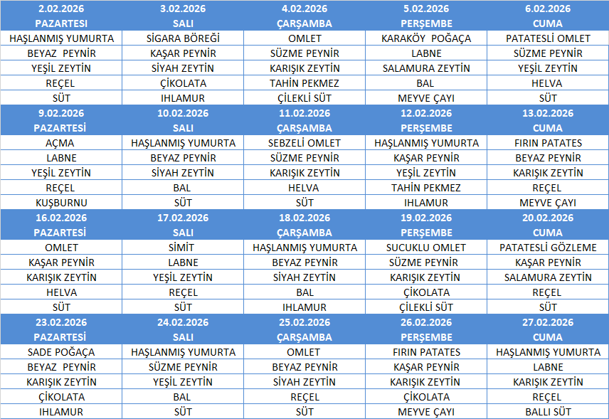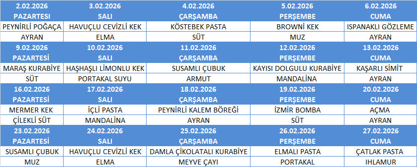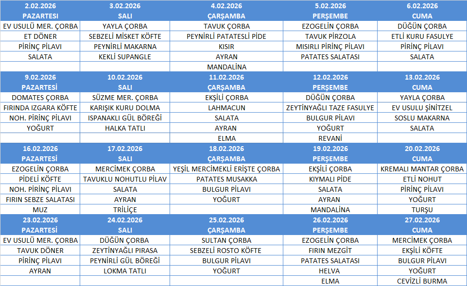 ŞUBAT AYI YEMEK MENÜSÜ